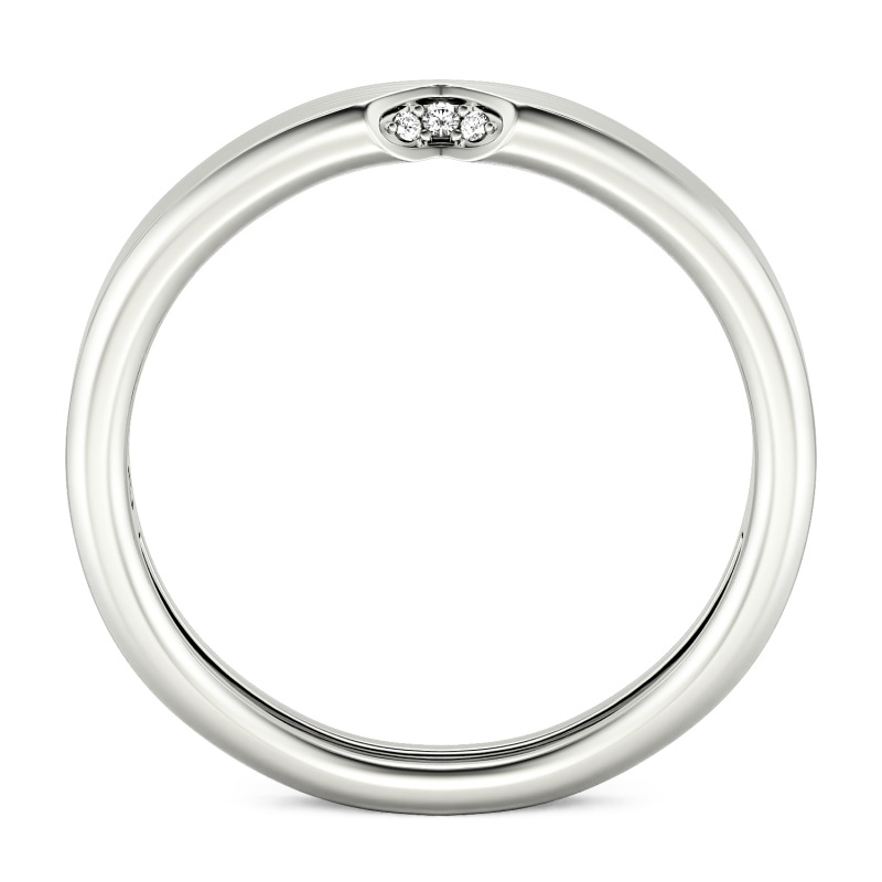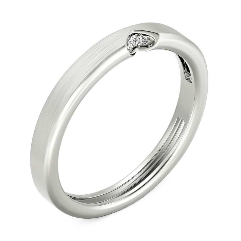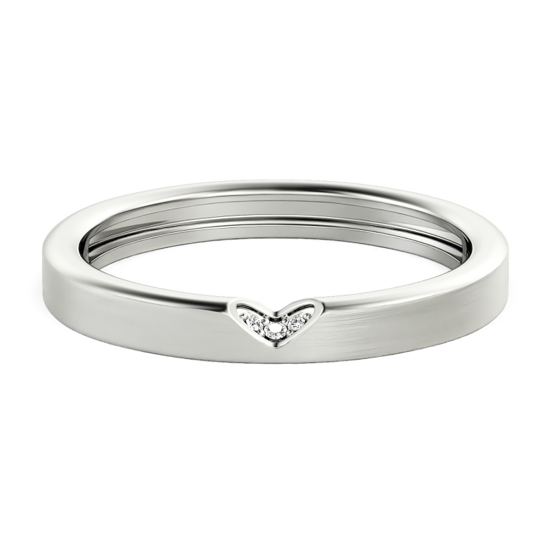 Crafted from sterling silver, this custom men's wedding band boasts a wonderful brushed finish. The standout feature is a distinctive v-shaped notch set with three sparkling stones, ingeniously designed to complement the heart-shaped point on the matching women's ring. Elevate this meaningful design by customizing the metal and stone colors to reflect your individual style and preferences. Whether you opt for classic silver with white stones or explore bolder combinations, this versatile mens wedding band offers comfort for everyday wear while making a statement about your commitment.