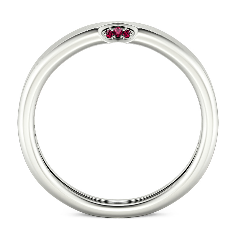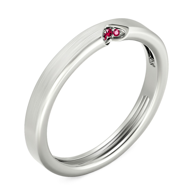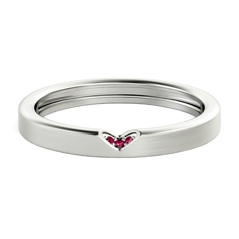 Crafted from sterling silver, this custom men's wedding band boasts a wonderful brushed finish. The standout feature is a distinctive v-shaped notch set with three sparkling stones, ingeniously designed to complement the heart-shaped point on the matching women's ring. Elevate this meaningful design by customizing the metal and stone colors to reflect your individual style and preferences. Whether you opt for classic silver with white stones or explore bolder combinations, this versatile mens wedding band offers comfort for everyday wear while making a statement about your commitment.