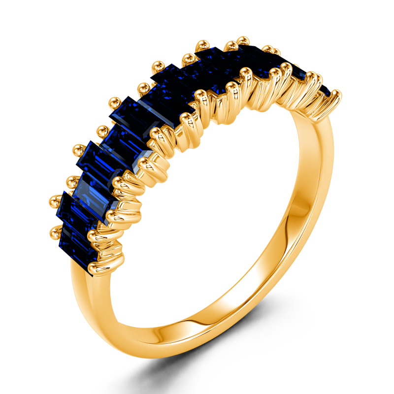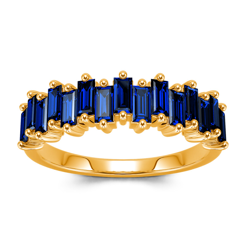 Promise to love, honor and cherish her with this charming moissanite wedding band. An alternating wave of emerald-cut stones dazzle along one third of the band for a modern and lustrous look. Perfect for all-day wear, the inside of the shank is rounded for comfort. On your wedding day or wedding anniversary, present her with a band that represents an eternity of love.