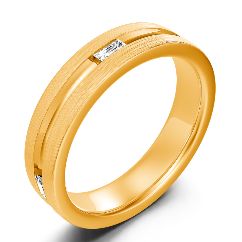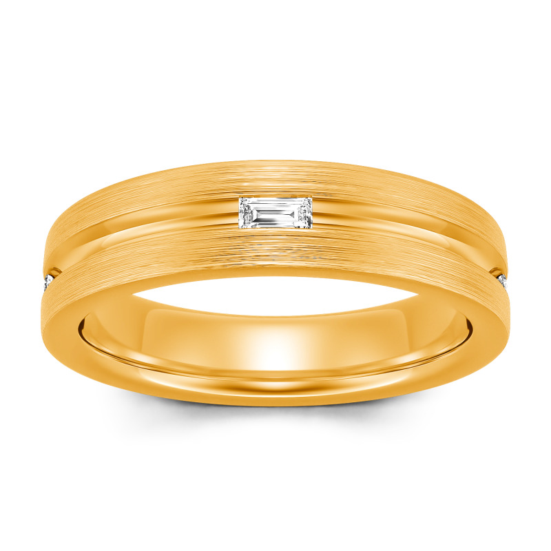 He'll appreciate the distinctive look of this fashion-forward wedding band. This unique ring features a high polish groove inlaid within a contemporary matte band. The alluring emerald-cut stones add an eye-catching flair. A streamlined style just for him, this wedding band is a modern expression of your affection.