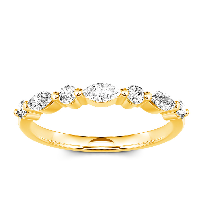 The lustrous moissanite stones are presented in an alternating fashion, set within marquise and round frames to shine gorgeously with the perfectly polished gold band. Vintage-inspired, a sparkling row of stones combines with the gleaming gold - a simple design that she can wear every day. Bring her a surprise on a special day. This gracious band is a thoughtful gift to commemorate your anniversary and memorialize your years spent together.
