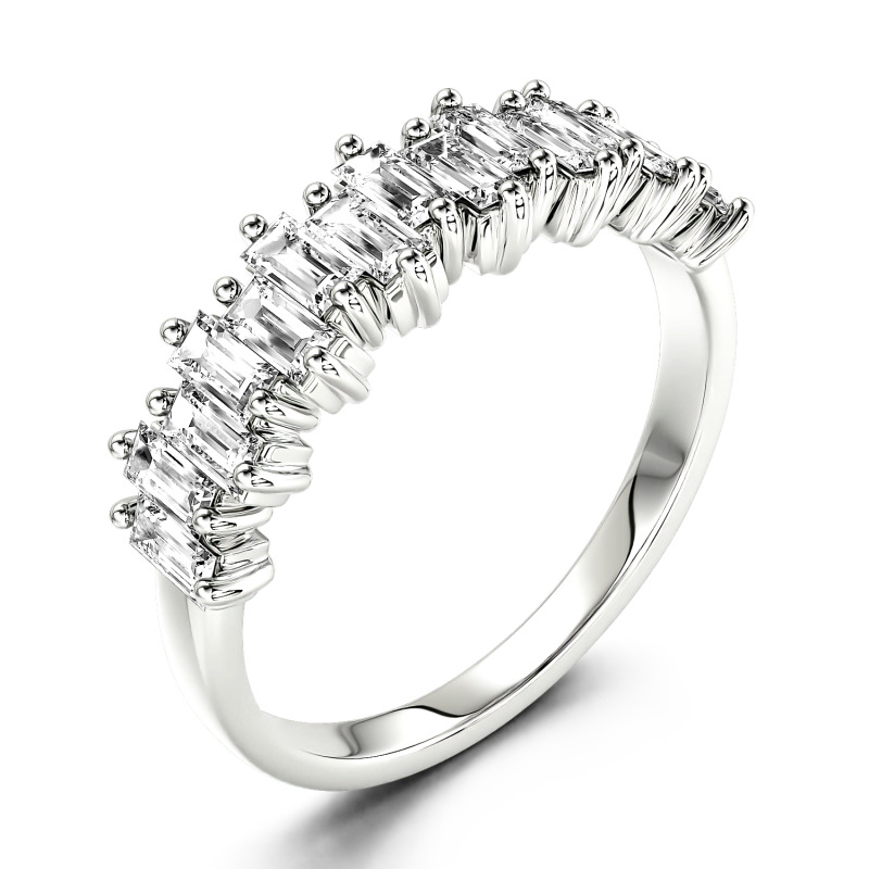 Promise to love, honor and cherish her with this charming moissanite wedding band. An alternating wave of emerald-cut stones dazzle along one third of the band for a modern and lustrous look. Perfect for all-day wear, the inside of the shank is rounded for comfort. On your wedding day or wedding anniversary, present her with a band that represents an eternity of love.