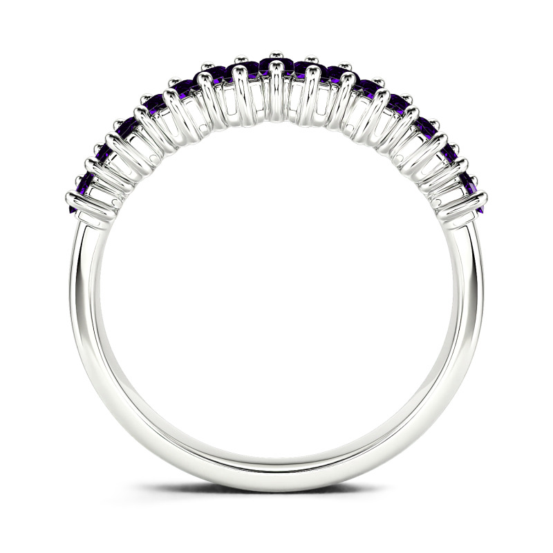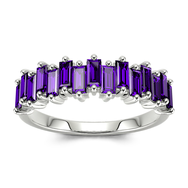 Promise to love, honor and cherish her with this charming moissanite wedding band. An alternating wave of emerald-cut stones dazzle along one third of the band for a modern and lustrous look. Perfect for all-day wear, the inside of the shank is rounded for comfort. On your wedding day or wedding anniversary, present her with a band that represents an eternity of love.