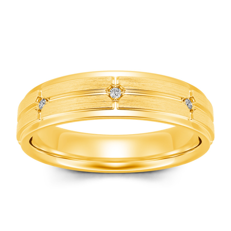 With smart details, this moissanite wedding band is a unique look for him. This sophisticated look showcases a grooved grid pattern dotted with shimmering round-cut stones. Stepped edges add further modern detail to the design. Begin your lifetime of love with this handsome wedding band for him.