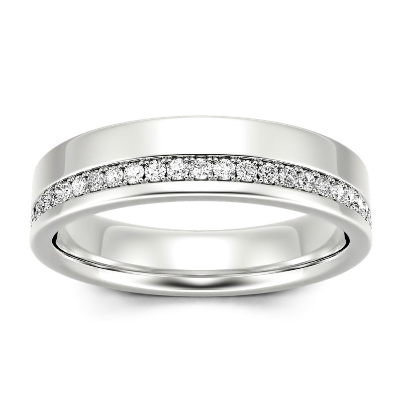 On your anniversary or wedding day, honor the man you love with a ring worthy of his affections. This unique design features a ribbon of petite channel-set stones along the edge of the modern polished look. Buffed to a brilliant shine, this ring is an elegant symbol of your marriage commitment.