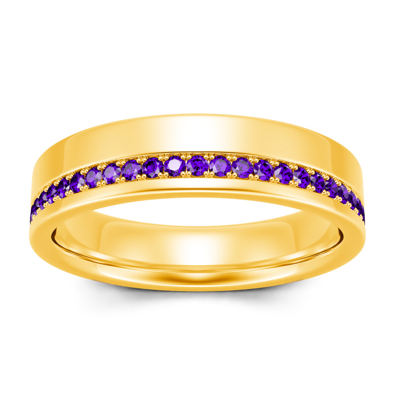 On your anniversary or wedding day, honor the man you love with a ring worthy of his affections. This unique design features a ribbon of petite channel-set stones along the edge of the modern polished look. Buffed to a brilliant shine, this ring is an elegant symbol of your marriage commitment.