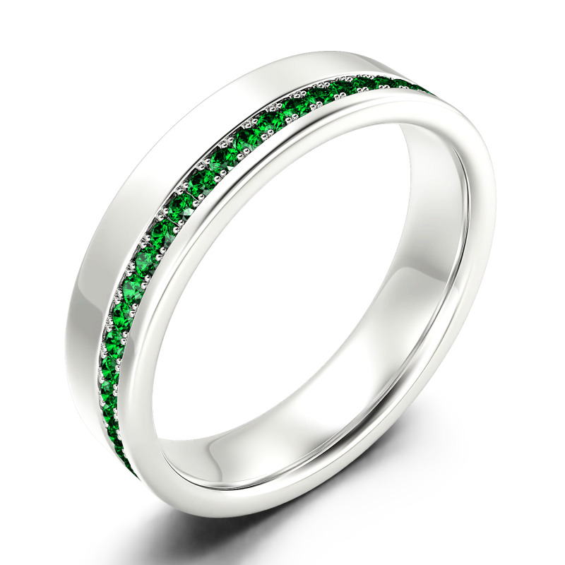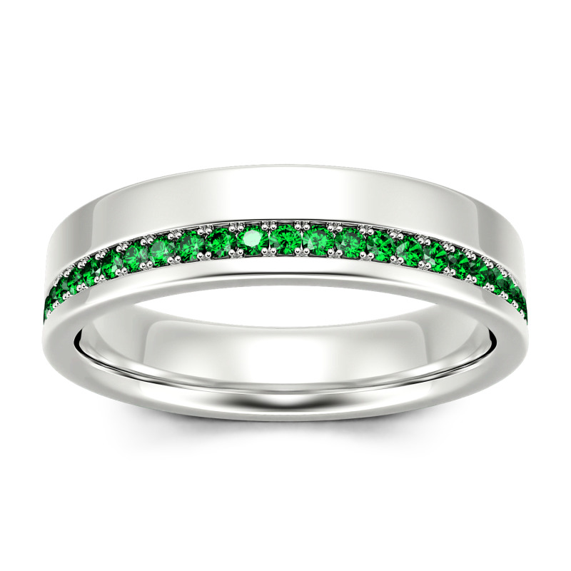 On your anniversary or wedding day, honor the man you love with a ring worthy of his affections. This unique design features a ribbon of petite channel-set stones along the edge of the modern polished look. Buffed to a brilliant shine, this ring is an elegant symbol of your marriage commitment.