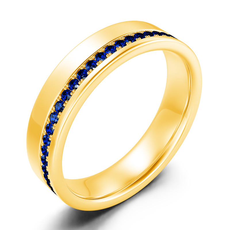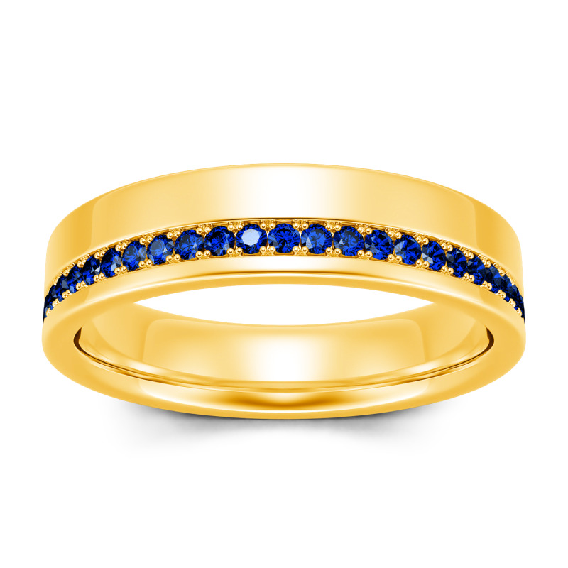 On your anniversary or wedding day, honor the man you love with a ring worthy of his affections. This unique design features a ribbon of petite channel-set stones along the edge of the modern polished look. Buffed to a brilliant shine, this ring is an elegant symbol of your marriage commitment.