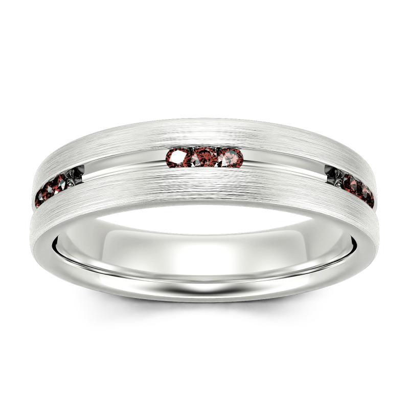 Smart and sophisticated, this wedding band is a handsome choice for your special day. This contemporary ring showcases channel-set stones that sparkle along the center of the band in an elegant satin finish while a matte-brushed interior adds a touch of design-forward uniqueness. On the day you say "I do," place this dazzling moissanite wedding band on his finger.