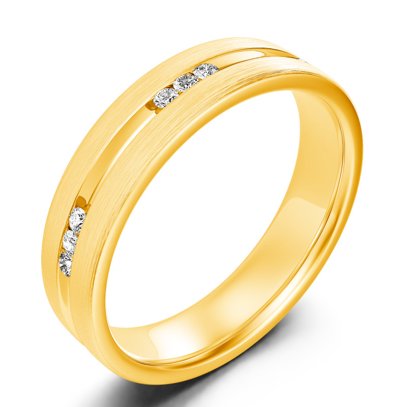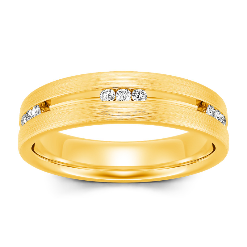 Smart and sophisticated, this wedding band is a handsome choice for your special day. This contemporary ring showcases channel-set stones that sparkle along the center of the band in an elegant satin finish while a matte-brushed interior adds a touch of design-forward uniqueness. On the day you say "I do," place this dazzling moissanite wedding band on his finger.