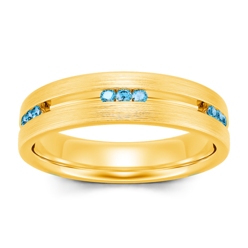 Smart and sophisticated, this wedding band is a handsome choice for your special day. This contemporary ring showcases channel-set stones that sparkle along the center of the band in an elegant satin finish while a matte-brushed interior adds a touch of design-forward uniqueness. On the day you say "I do," place this dazzling moissanite wedding band on his finger.