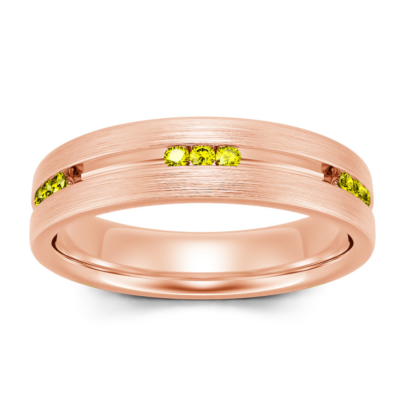 Smart and sophisticated, this wedding band is a handsome choice for your special day. This contemporary ring showcases channel-set stones that sparkle along the center of the band in an elegant satin finish while a matte-brushed interior adds a touch of design-forward uniqueness. On the day you say "I do," place this dazzling moissanite wedding band on his finger.