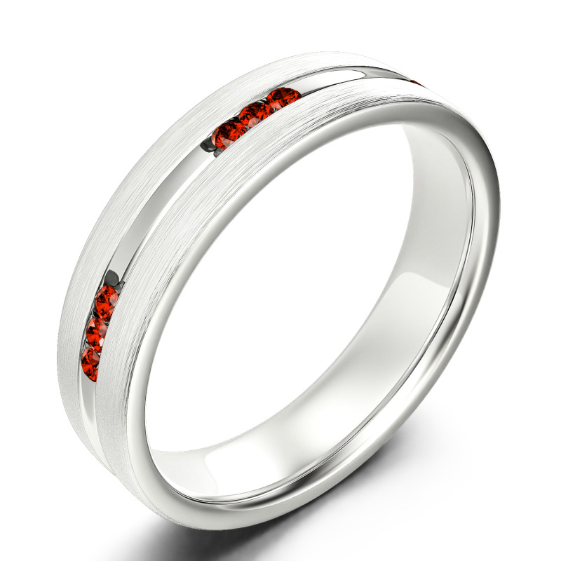Smart and sophisticated, this wedding band is a handsome choice for your special day. This contemporary ring showcases channel-set stones that sparkle along the center of the band in an elegant satin finish while a matte-brushed interior adds a touch of design-forward uniqueness. On the day you say "I do," place this dazzling moissanite wedding band on his finger.