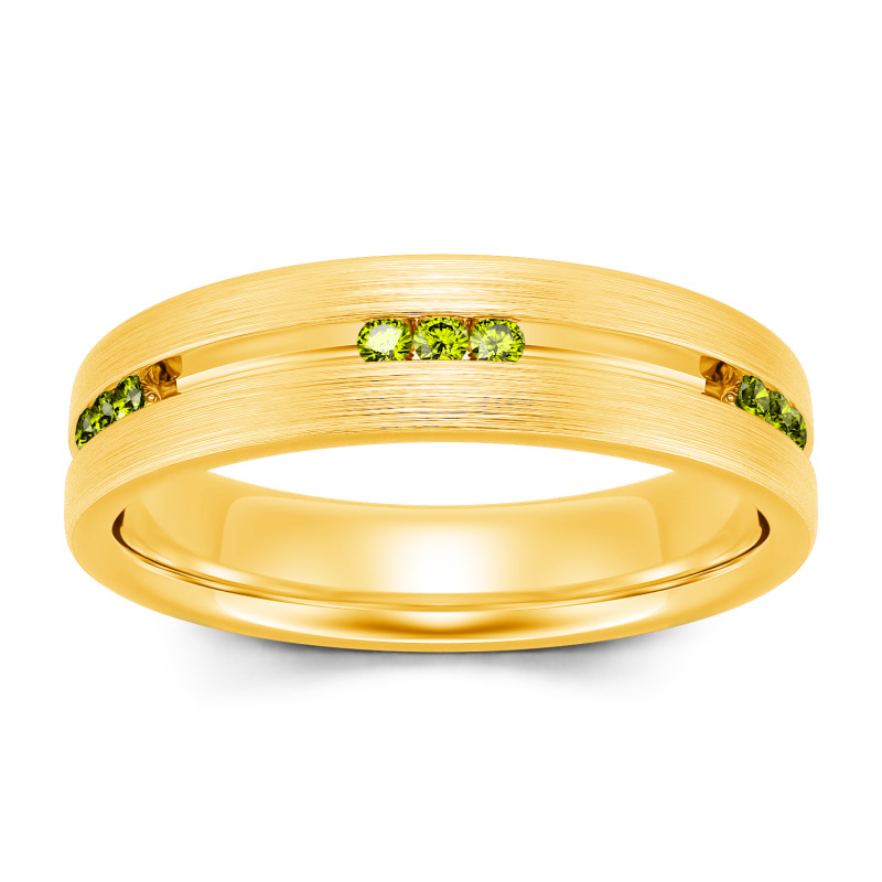 Smart and sophisticated, this wedding band is a handsome choice for your special day. This contemporary ring showcases channel-set stones that sparkle along the center of the band in an elegant satin finish while a matte-brushed interior adds a touch of design-forward uniqueness. On the day you say "I do," place this dazzling moissanite wedding band on his finger.
