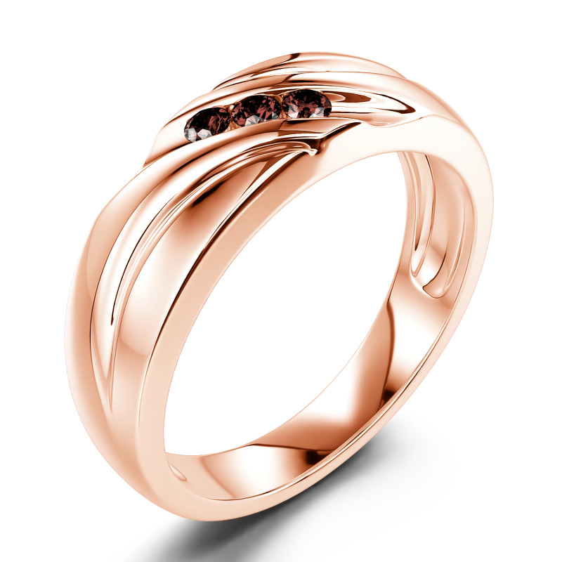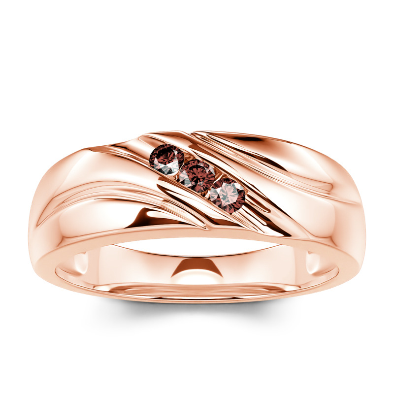 Contoured lines and a trio of moissanite flow along this handsome men's wedding band. This piece is highlighted by a diagonal stripe of three round stones adding a touch of eye-catching style. The perfectly polished finish, together with the striking shine of channel-set stones, is definitely a fashionable choice for him.