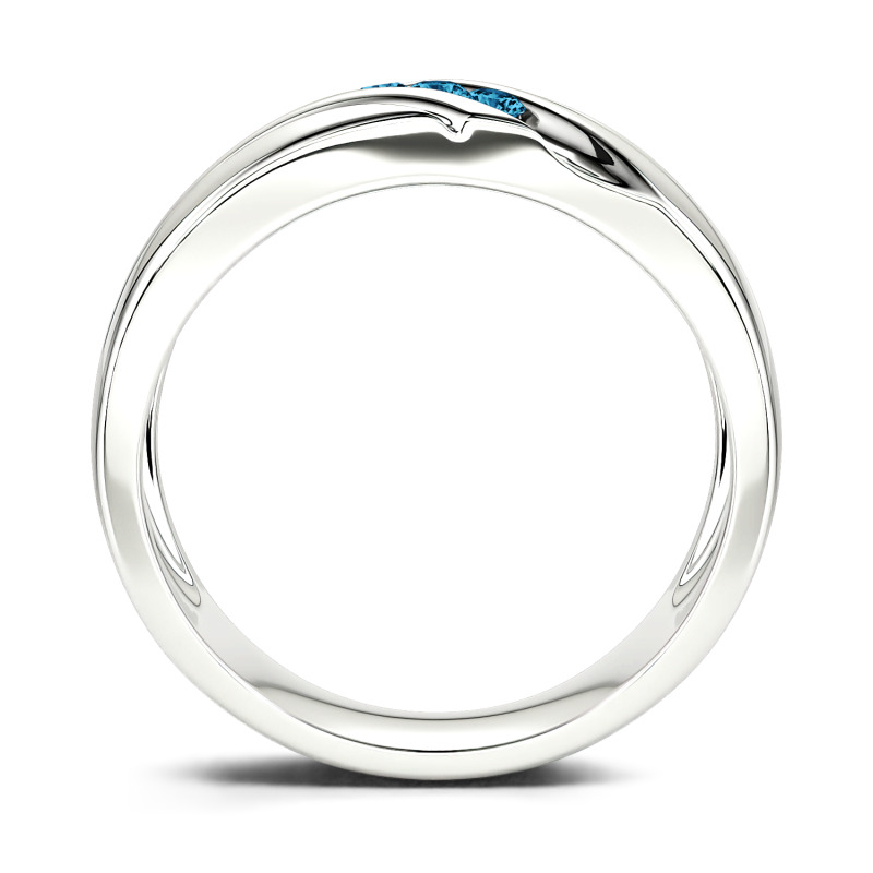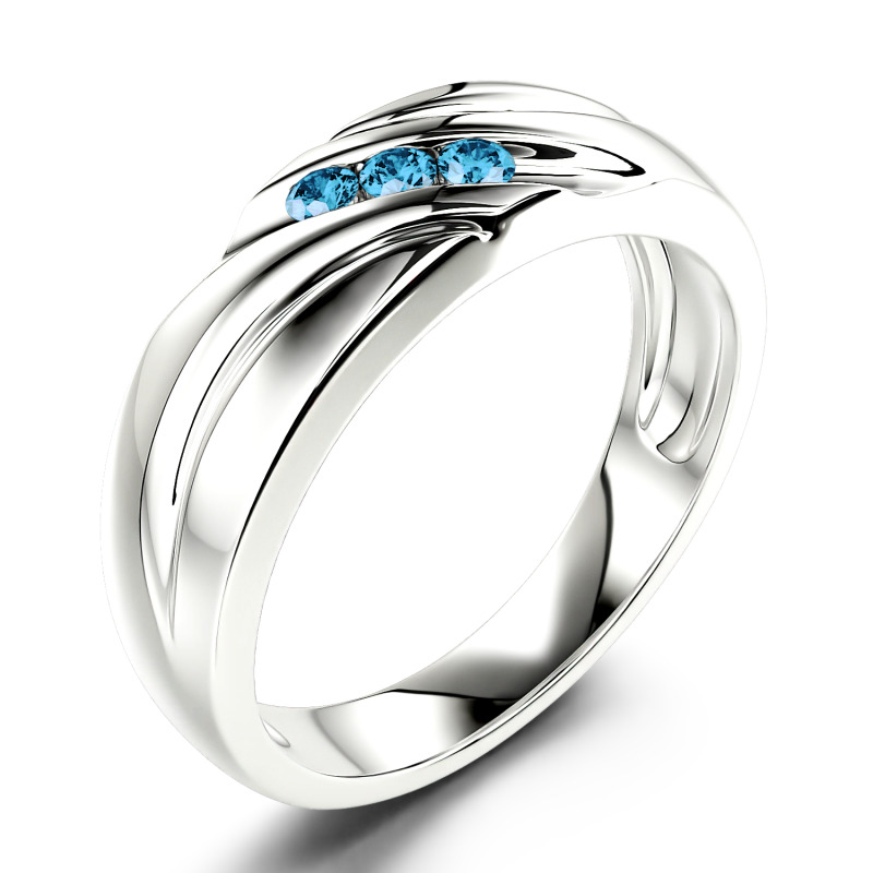 Contoured lines and a trio of moissanite flow along this handsome men's wedding band. This piece is highlighted by a diagonal stripe of three round stones adding a touch of eye-catching style. The perfectly polished finish, together with the striking shine of channel-set stones, is definitely a fashionable choice for him.