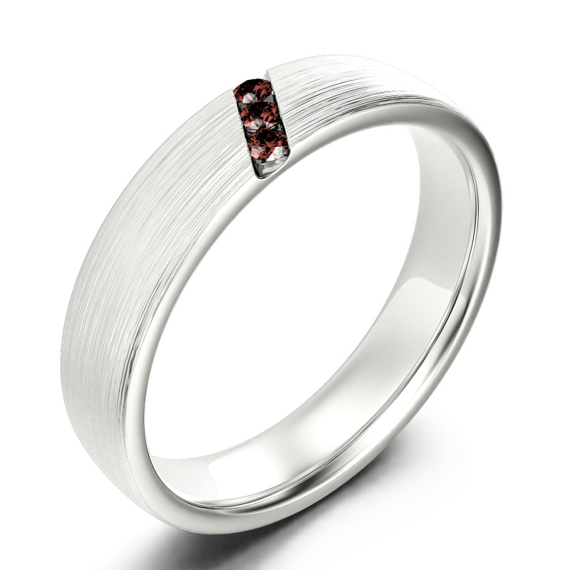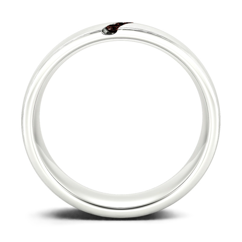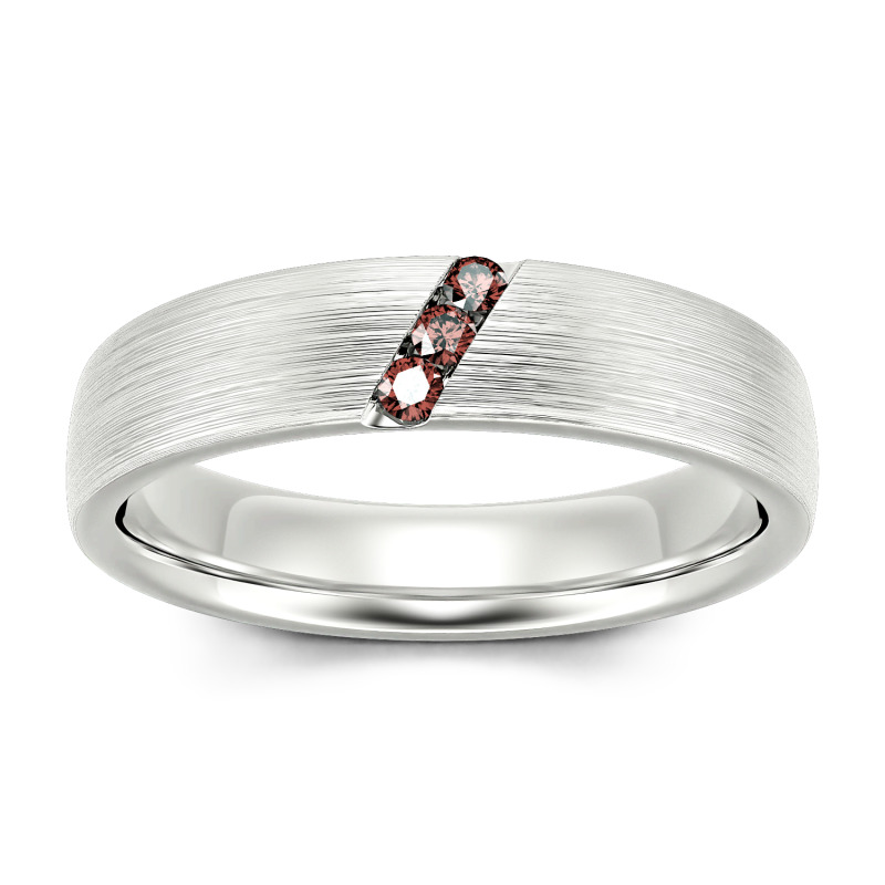 He'll appreciate the sleek design of this moissanite wedding band. A striking diagonal line of stones creates a unique, eye-catching design in this matte-brushed ring. The inside of the shank is rounded for comfortable wear. Buffed to a brilliant luster, this comfort-fit wedding band seals your vows in style.