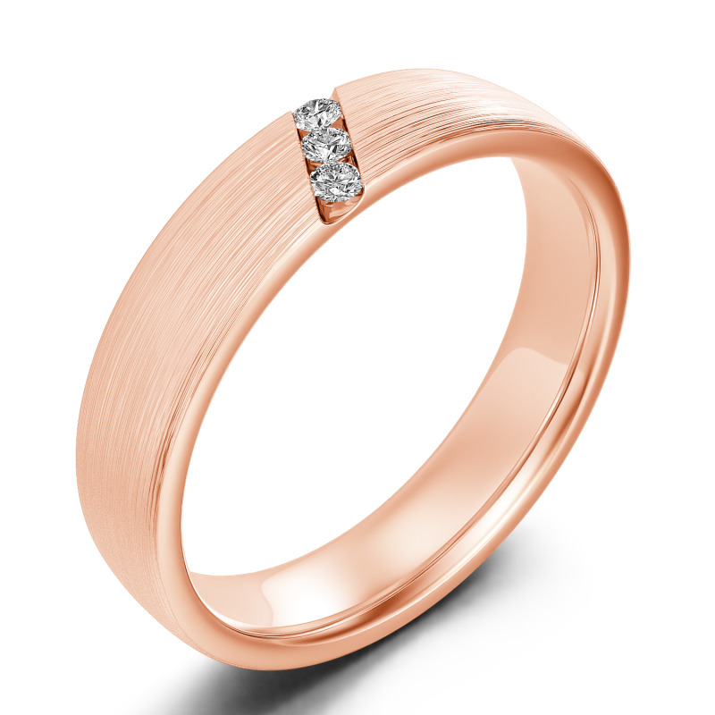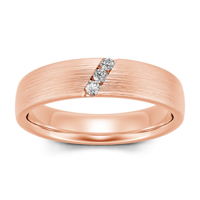 He'll appreciate the sleek design of this moissanite wedding band. A striking diagonal line of stones creates a unique, eye-catching design in this matte-brushed ring. The inside of the shank is rounded for comfortable wear. Buffed to a brilliant luster, this comfort-fit wedding band seals your vows in style.