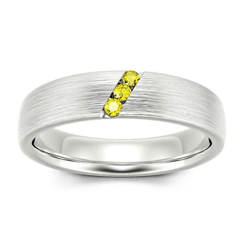 He'll appreciate the sleek design of this moissanite wedding band. A striking diagonal line of stones creates a unique, eye-catching design in this matte-brushed ring. The inside of the shank is rounded for comfortable wear. Buffed to a brilliant luster, this comfort-fit wedding band seals your vows in style.