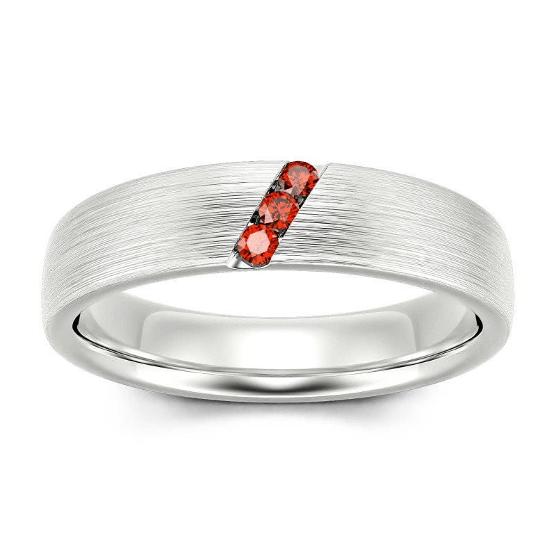 He'll appreciate the sleek design of this moissanite wedding band. A striking diagonal line of stones creates a unique, eye-catching design in this matte-brushed ring. The inside of the shank is rounded for comfortable wear. Buffed to a brilliant luster, this comfort-fit wedding band seals your vows in style.