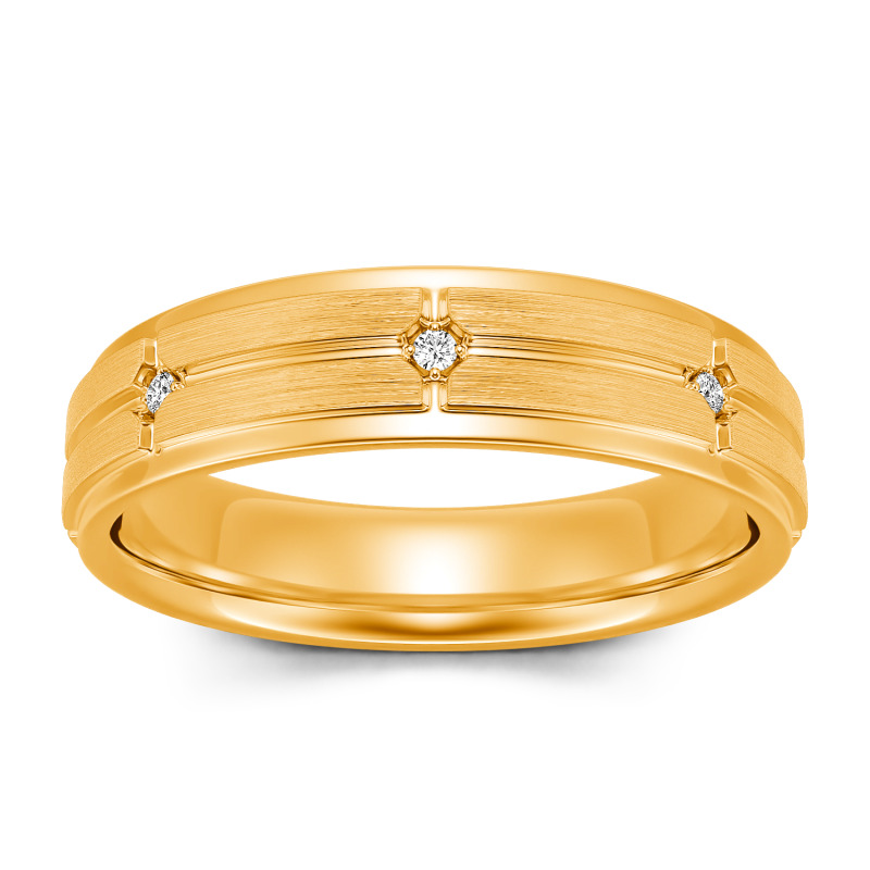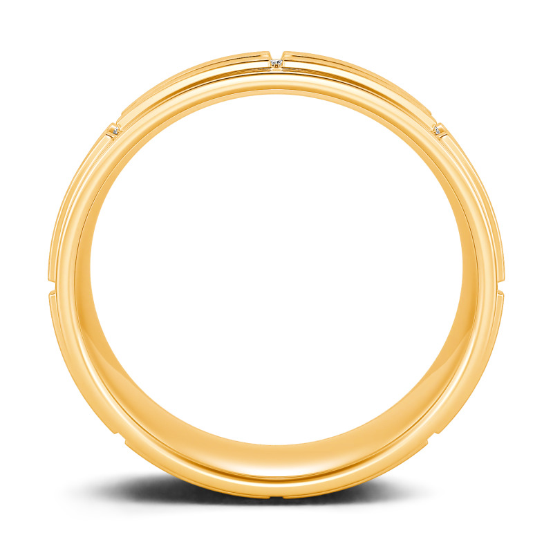 With smart details, this wedding band is a unique look for him. This sophisticated look showcases a grooved grid pattern dotted with shimmering round-cut stones. Stepped edges add further modern detail to the design. Begin your lifetime of love with this handsome wedding band for him.