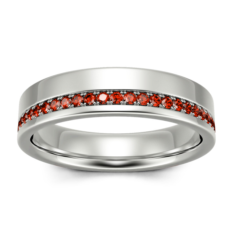 On your anniversary or wedding day, honor the man you love with a ring worthy of his affections. This unique design features a ribbon of petite channel-set stones along the edge of the modern polished look. Buffed to a brilliant shine, this ring is an elegant symbol of your marriage commitment.