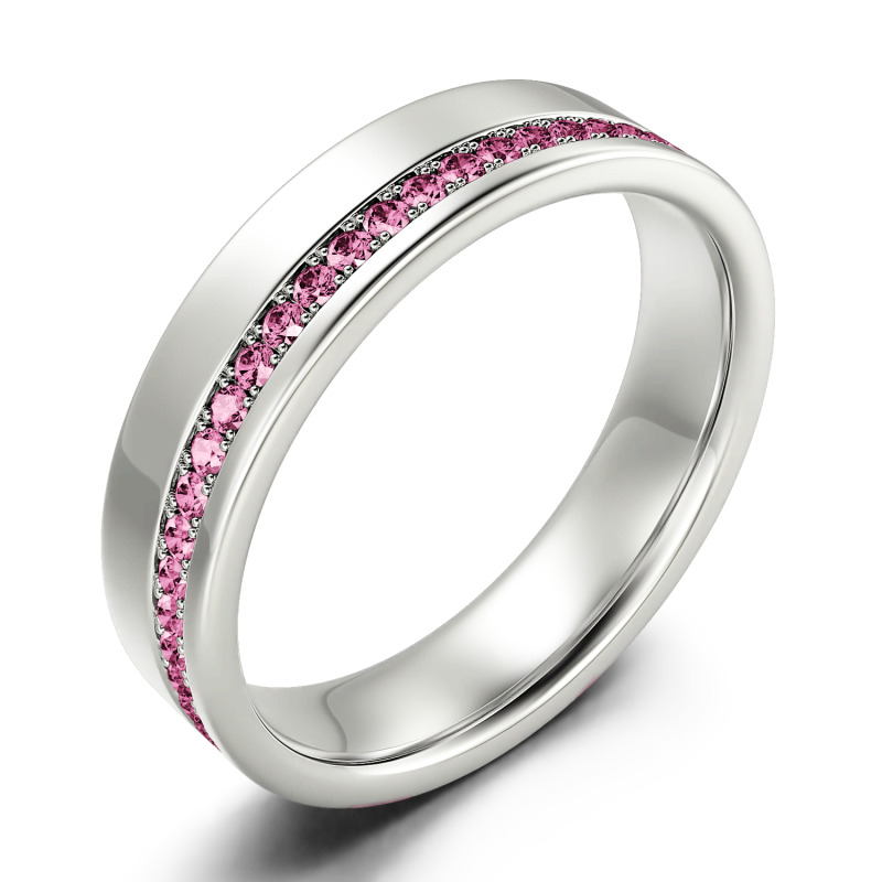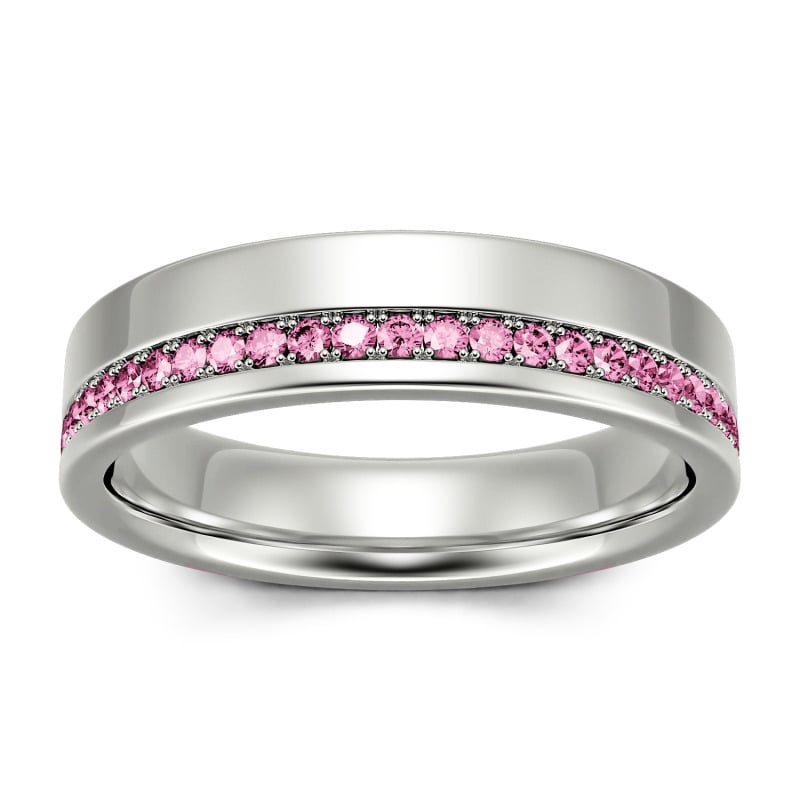 On your anniversary or wedding day, honor the man you love with a ring worthy of his affections. This unique design features a ribbon of petite channel-set stones along the edge of the modern polished look. Buffed to a brilliant shine, this ring is an elegant symbol of your marriage commitment.