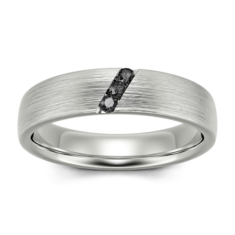 He'll appreciate the sleek design of this moissanite wedding band. A striking diagonal line of stones creates a unique, eye-catching design in this matte-brushed ring. The inside of the shank is rounded for comfortable wear. Buffed to a brilliant luster, this comfort-fit wedding band seals your vows in style.