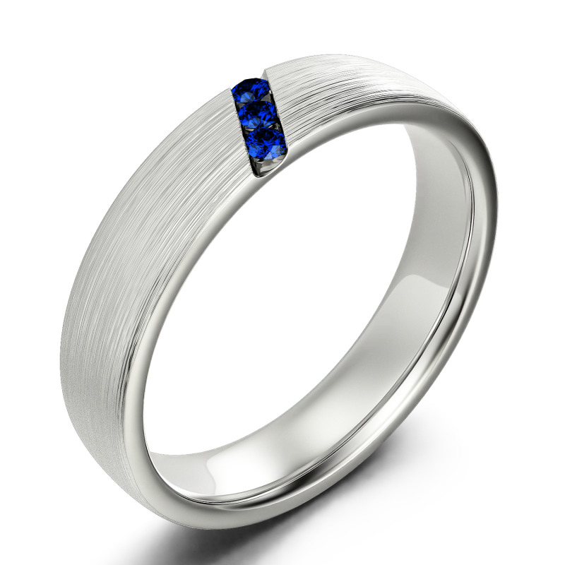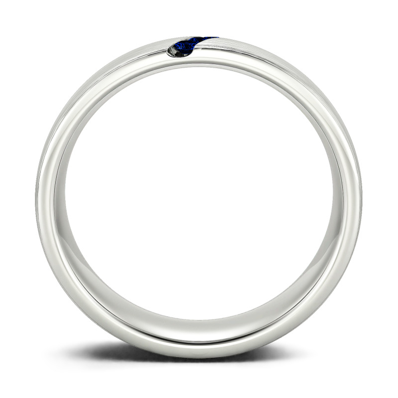 He'll appreciate the sleek design of this moissanite wedding band. A striking diagonal line of stones creates a unique, eye-catching design in this matte-brushed ring. The inside of the shank is rounded for comfortable wear. Buffed to a brilliant luster, this comfort-fit wedding band seals your vows in style.