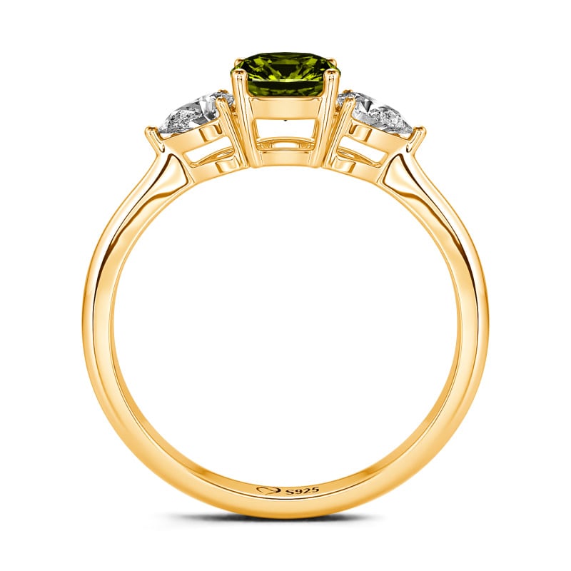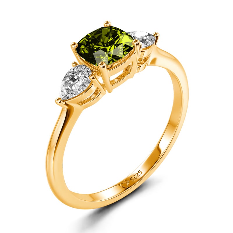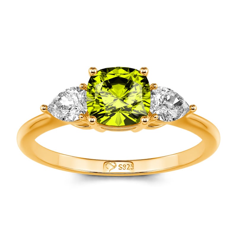 Sweet, simple and delicate ring. Great for creating a minimalist look or for stacking. It adds a fun splash of colour to your look! This ring has a cushion cut with pear shaped stones on either side for a delicate look!