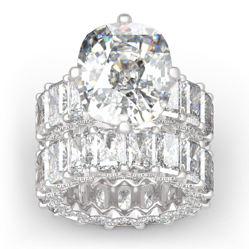 Crafted with care in every detail, this sparkling ring set displays an impressive level of artistry. A cushion cut stone shines brightly at the center, while additional stones adorn the ring's shank in three sides, creating a truely dazzling look from any angle. On your special day, a coordinating eternity band completes this fabulous ensemble. This stunning style offers incomparable beauty and unmatched quality.