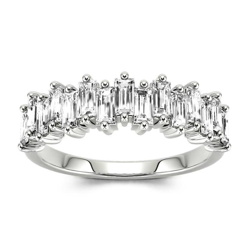 Promise to love, honor and cherish her with this charming moissanite wedding band. An alternating wave of emerald-cut stones dazzle along one third of the band for a modern and lustrous look. Perfect for all-day wear, the inside of the shank is rounded for comfort. On your wedding day or wedding anniversary, present her with a band that represents an eternity of love.