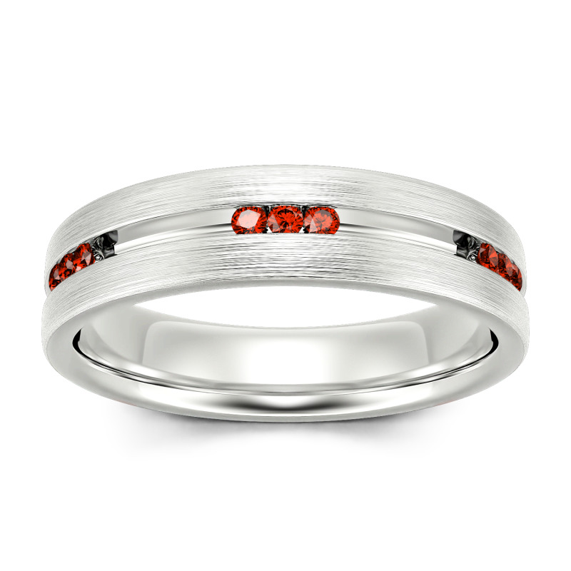 Smart and sophisticated, this wedding band is a handsome choice for your special day. This contemporary ring showcases channel-set stones that sparkle along the center of the band in an elegant satin finish while a matte-brushed interior adds a touch of design-forward uniqueness. On the day you say "I do," place this dazzling moissanite wedding band on his finger.
