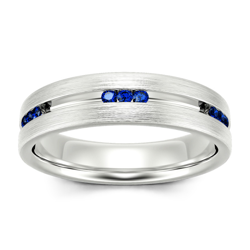Smart and sophisticated, this wedding band is a handsome choice for your special day. This contemporary ring showcases channel-set stones that sparkle along the center of the band in an elegant satin finish while a matte-brushed interior adds a touch of design-forward uniqueness. On the day you say "I do," place this dazzling moissanite wedding band on his finger.