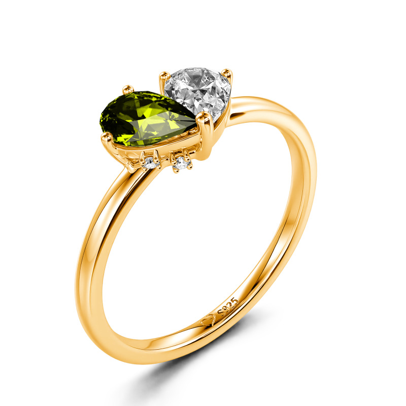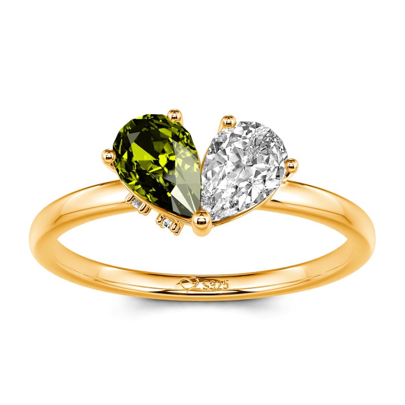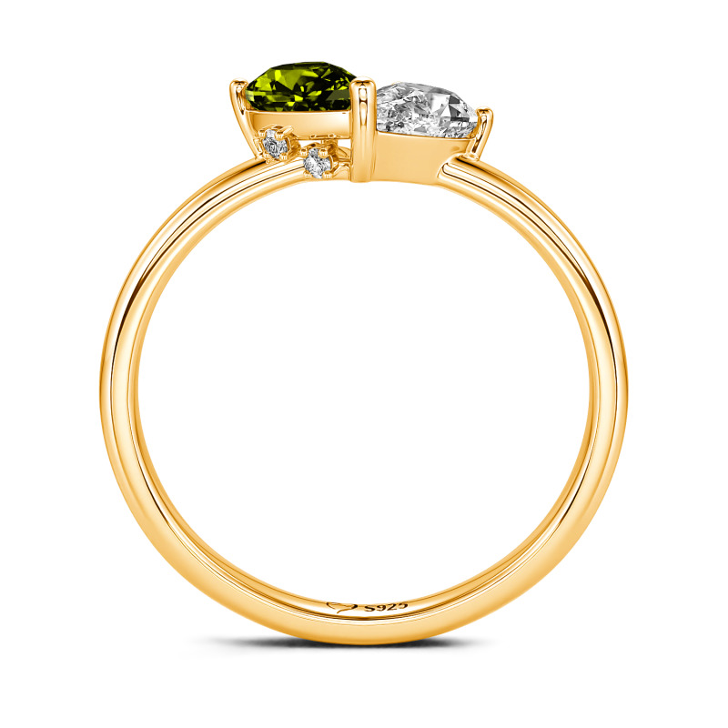 Two pear cut stones are arranged to form a heart at the center of the design. Two tiny stone accents at the base of the piece anchor it in place. They are set together to form this petite heart stacker. You can choose different-color stones for the center stone to make a unique look for the ring. Just design a piece of jewelry by yourself.