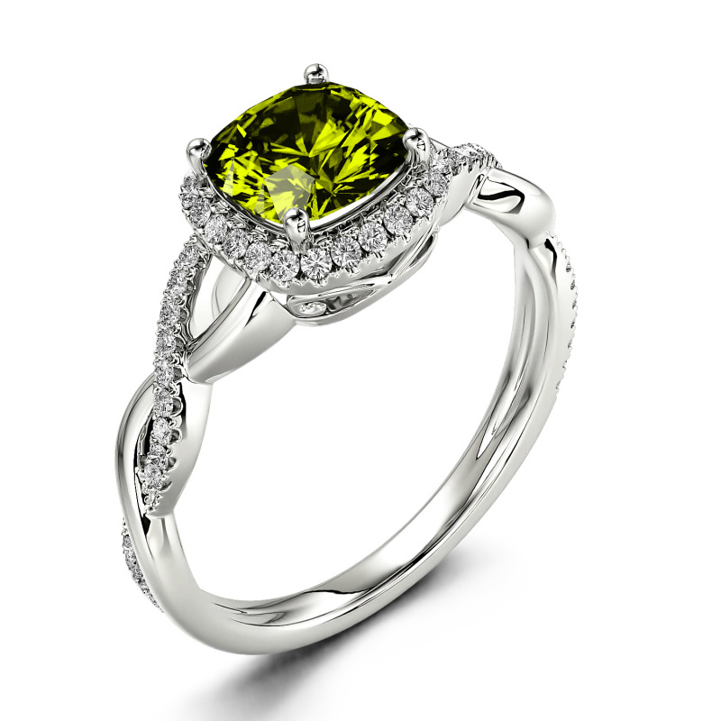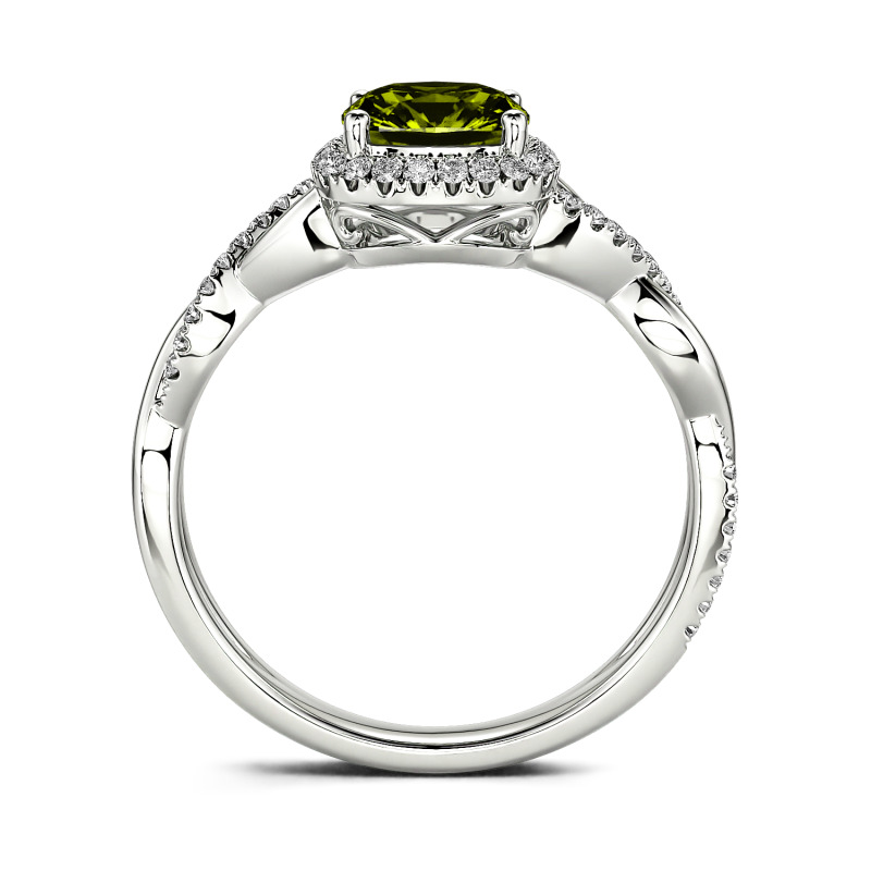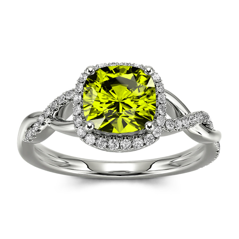 Express your love with the charming twist design of this moissanite engagement ring. This elegant design showcases a sparkling cushion-cut center stone wrapped in a frame of round stones. Along the shank, polished and sparkling stone-lined ribbons shine in a crossover design. Buffed to a brilliant luster, this engagement ring is an elegant choice.