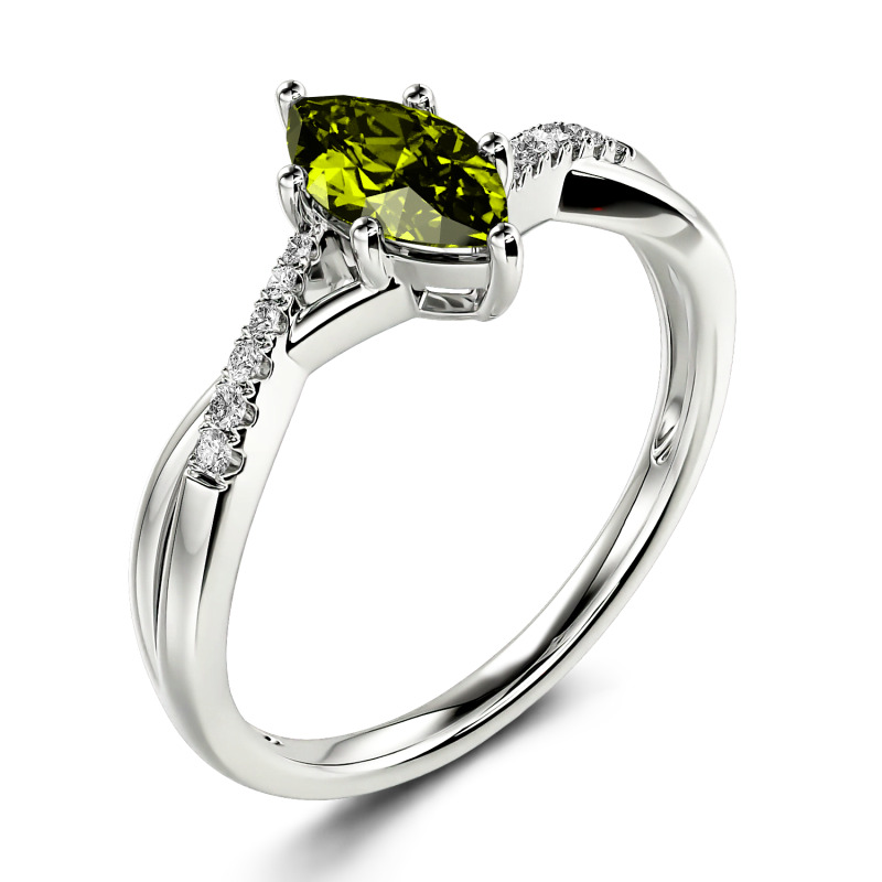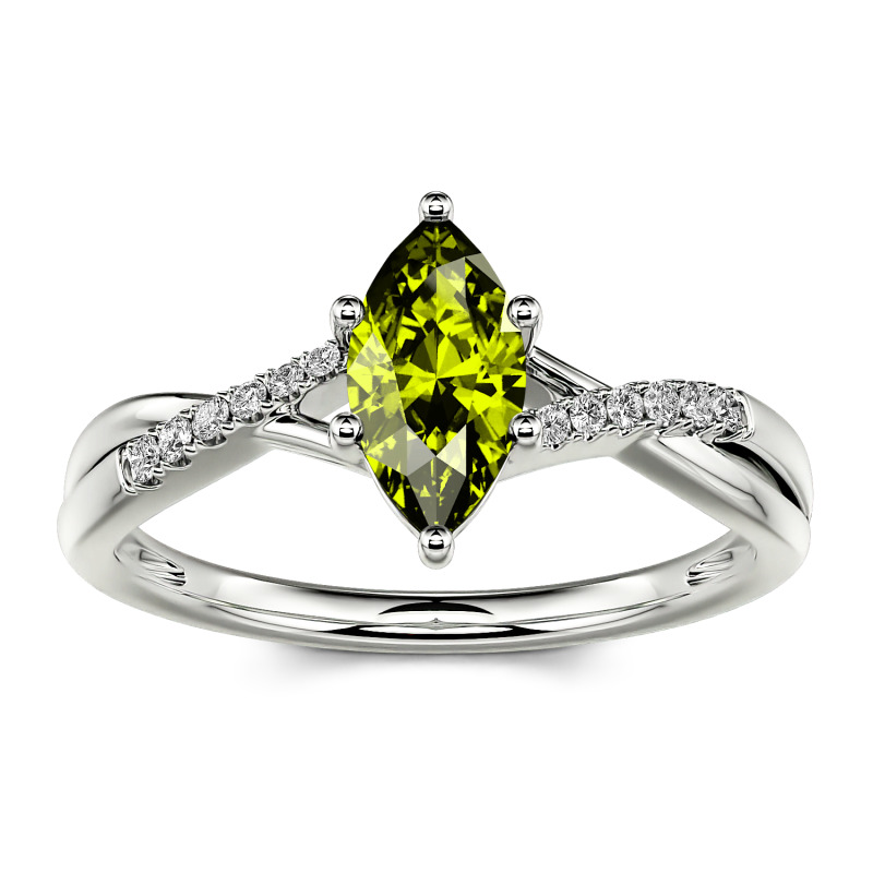 A majestic marquise-cut centrepiece is set in 6 prongs, with gleaming stone-paving shoulders of a subtle twisting design elegantly framing the center moissanite. This beautiful moissanite ring sparks with her delicate skin and adds splendors to her garment. The slim crossing shoulders emit exquisite radiance, complementing the sparkle of the center stone. Dainty and enchanting, this precious ring will meet her special and sophisticated taste.
